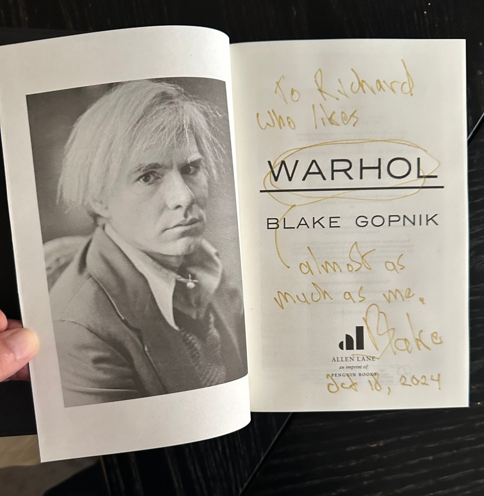 I had the honour/great good fortune to be seated beside Blake Gopnik at the preview dinner and we had a fascinating discussion. He kindly offfered to sign my copy of his Warhol biography.