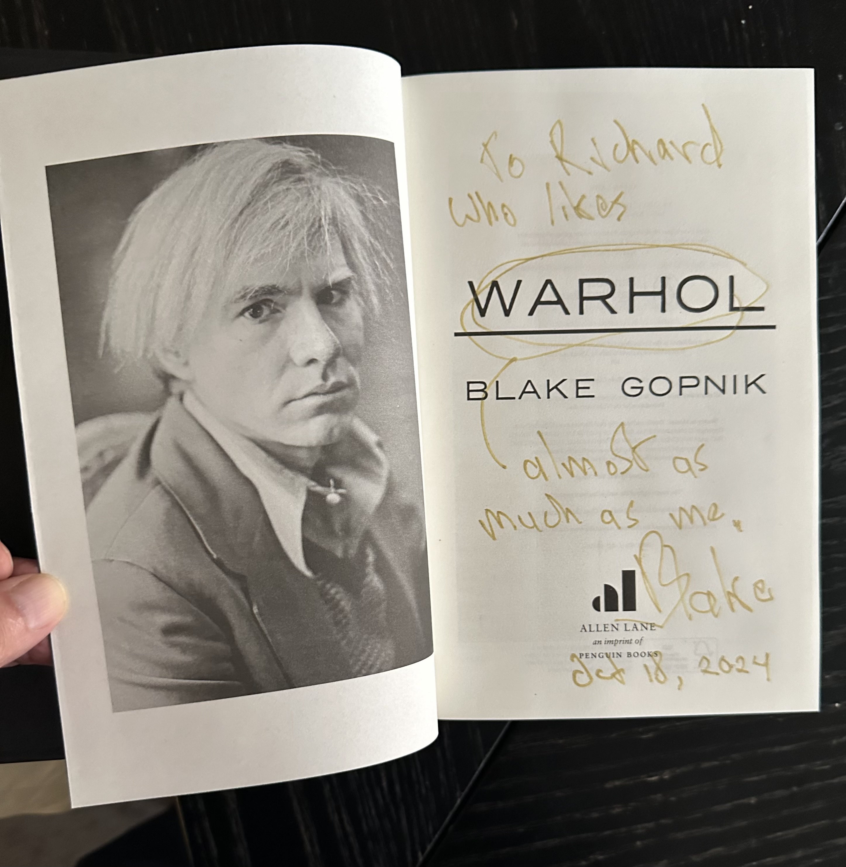 I had the honour/great good fortune to be seated beside Blake Gopnik at the preview dinner and we had a fascinating discussion. He kindly offfered to sign my copy of his Warhol biography.