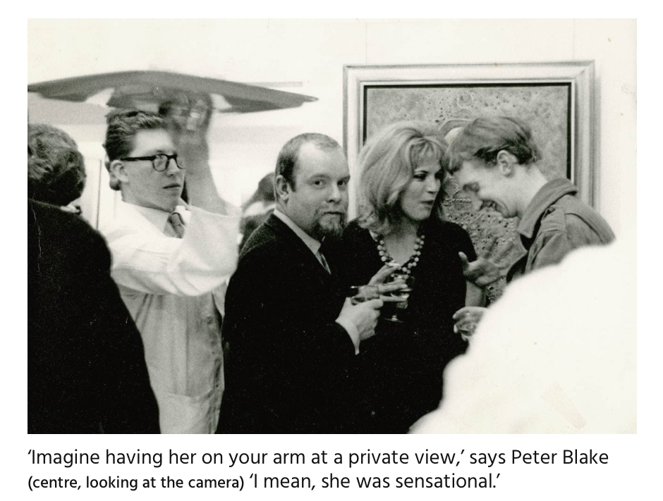 Exactly when Blake’s and Boty’s relationship ended is difficult to date. Boty was in a long-term relationship with the married television director Philip Saville and had other assignations. In June 1963 she married literary agent Clive Goodwin after a whirlwind 10-day romance. Both Blake and Saville were reported to have been shocked by her marriage. And Peter Blake married Jann Haworth the following month.